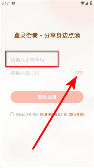 1、打開街巷客戶端,在用戶協(xié)議彈窗中點(diǎn)擊同意,進(jìn)入登錄界面。