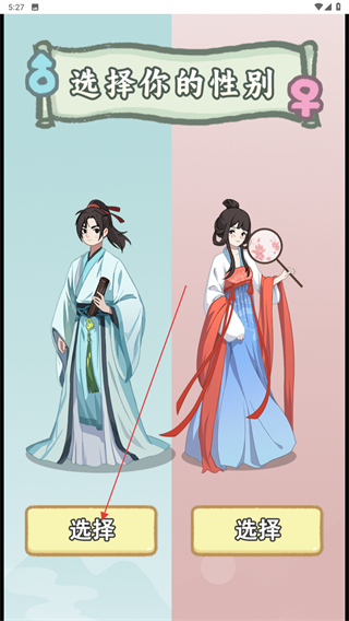 1、在選擇你的性別界面,點(diǎn)擊對應(yīng)角色形象下方的選擇按鈕,即可選定角色性別,開啟后續(xù)的游戲流程。