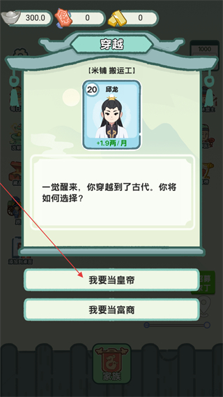 2、在穿越界面,閱讀劇情提示后點(diǎn)擊我要當(dāng)皇帝選項(xiàng),選定該發(fā)展路線,推進(jìn)游戲的劇情進(jìn)程。