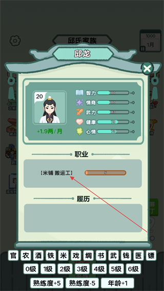 4、在角色個(gè)人信息界面,可以查看到當(dāng)前職業(yè)為米鋪搬運(yùn)工,后續(xù)可提升職業(yè)熟練度來解鎖更高等級,推進(jìn)角色的發(fā)展進(jìn)程。
