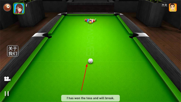 4、進(jìn)入臺(tái)球?qū)纸缑?,根?jù)提示操控白球,開(kāi)始進(jìn)行擊球操作。