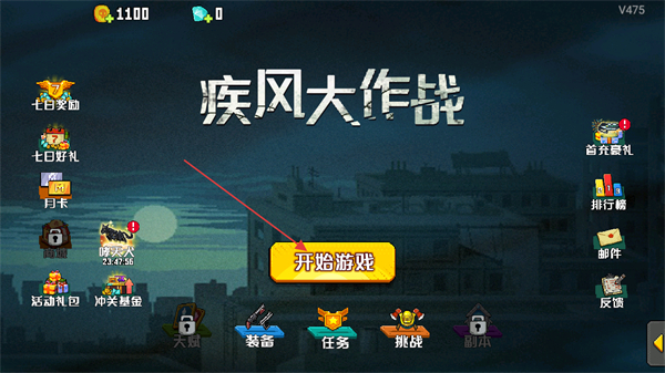 1、在疾風(fēng)大作戰(zhàn)的主界面點(diǎn)擊開始游戲按鈕進(jìn)入游戲界面?zhèn)冗呥€有七日獎(jiǎng)勵(lì)等功能可按需查看。
