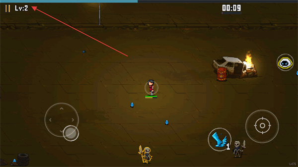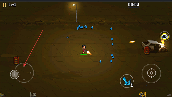 3、通過不斷擊殺喪尸掉落的能量水晶將角色升級(jí)到Lv.2后,繼續(xù)通過左下角的移動(dòng)搖桿操控角色行動(dòng)推進(jìn)當(dāng)前關(guān)卡的游戲流程。