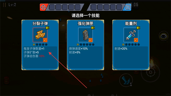 4、當(dāng)角色升級(jí)后進(jìn)入技能選擇界面,可選擇分裂子彈技能,提升每發(fā)子彈數(shù)量等戰(zhàn)斗屬性以增強(qiáng)戰(zhàn)力。