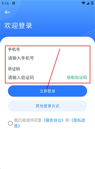 4、在驗(yàn)證碼登錄界面,填寫手機(jī)號、驗(yàn)證碼,點(diǎn)擊立即登錄,完成賬號登錄。