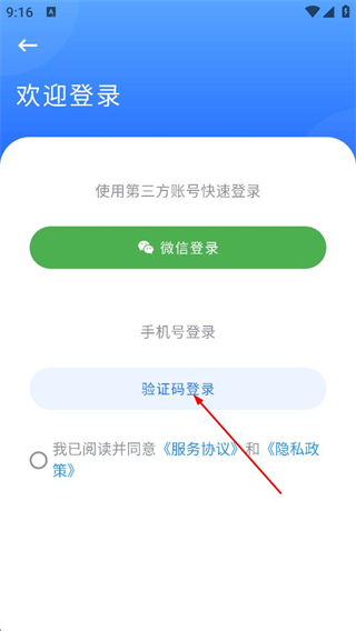 3、在登錄方式選擇頁面,點(diǎn)擊驗(yàn)證碼登錄選項,進(jìn)入驗(yàn)證碼登錄界面。