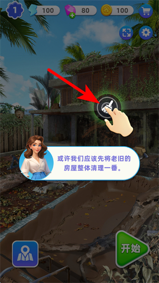 2、根據(jù)指引點擊房屋區(qū)域的互動按鈕,開啟房屋清理/裝修的任務流程。
