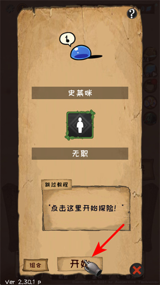 2、進(jìn)入角色選擇界面后,確認(rèn)初始角色如史萊姆的信息,點(diǎn)擊開始按鈕開啟探險(xiǎn)流程,這是進(jìn)入游戲核心玩法的關(guān)鍵步驟。體驗(yàn)地牢探險(xiǎn)內(nèi)容。