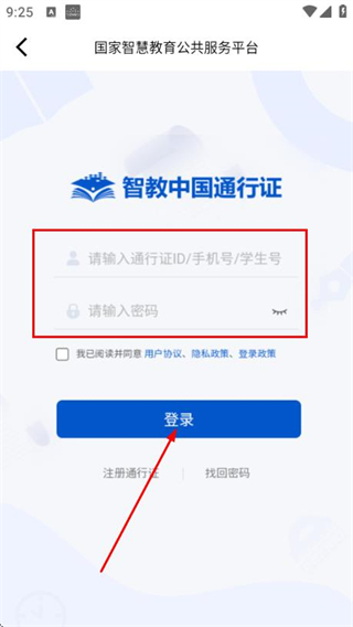 3、在登錄頁面填寫手機(jī)號和密碼,勾選協(xié)議后,點(diǎn)擊登錄完成賬號登錄操作。