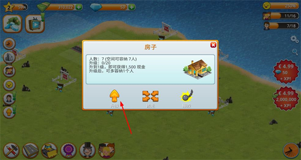 2、點(diǎn)擊建筑彈窗內(nèi)升級(jí)按鈕,提升建筑等級(jí),增加人口并獲取更多資金,助力城市發(fā)展。