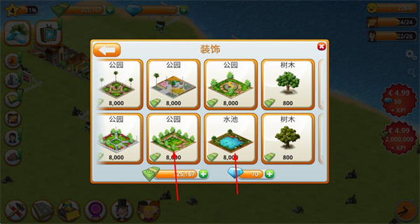 4、在裝飾界面,消耗資源購(gòu)買裝飾設(shè)施,豐富城市景觀,優(yōu)化城市環(huán)境。