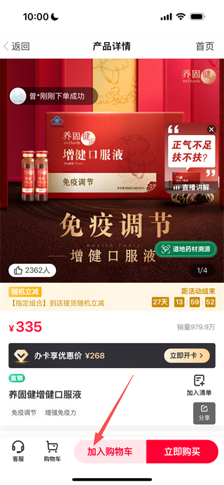 4、在單品詳情頁,點擊加入購物車按鈕,即可將該商品加入購物車。