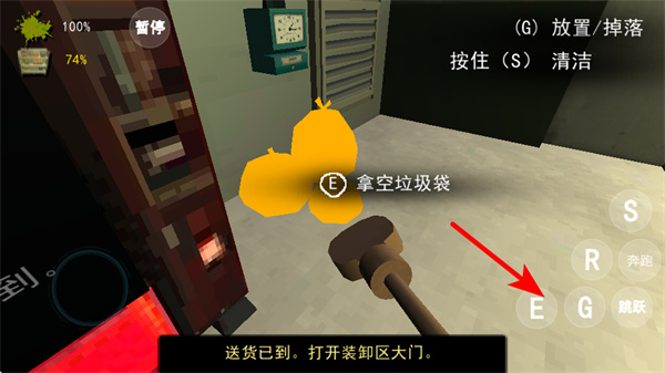 1、在室內(nèi)場(chǎng)景中,點(diǎn)擊對(duì)應(yīng)按鍵如E拾取垃圾袋,獲取這類道具可用于完成清潔相關(guān)任務(wù),同時(shí)留意界面的任務(wù)提示如打開裝卸區(qū)大門。