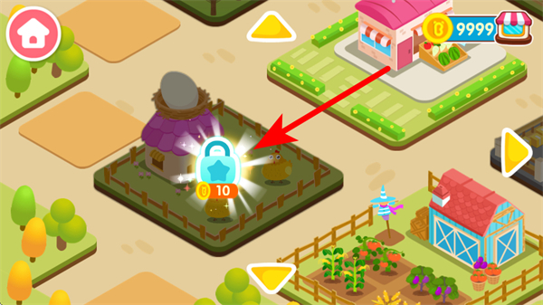 2、在農(nóng)場(chǎng)地圖中,點(diǎn)擊帶鎖的區(qū)域消耗對(duì)應(yīng)貨幣,示例中10金幣,解鎖新的農(nóng)場(chǎng)區(qū)域以拓展經(jīng)營(yíng)空間。