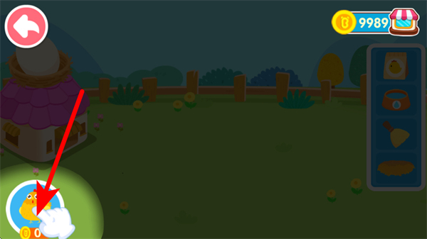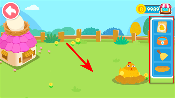 3、在解鎖的區(qū)域內(nèi),點(diǎn)擊右側(cè)道具欄中的小雞道具,將其放置到農(nóng)場(chǎng)場(chǎng)景中,完成養(yǎng)殖類(lèi)道具的布置。