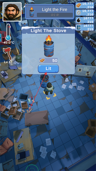 4、進(jìn)入建筑后觸發(fā)生火任務(wù),界面顯示LightTheStove操作需消耗50木板,點(diǎn)擊Lit按鈕即可完成生火,這一操作能幫助抵御當(dāng)前的低溫環(huán)境。