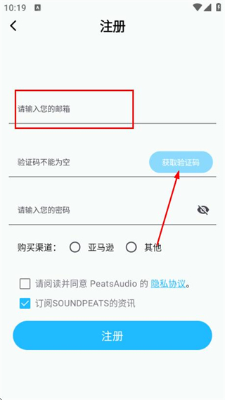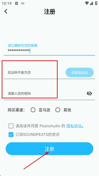 3、在注冊賬號頁面填寫驗證碼和密碼,勾選協(xié)議后點擊注冊按鈕完成賬號注冊操作。