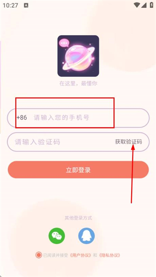 2、在手機登錄頁面填寫手機號,勾選協(xié)議后,點擊獲取驗證碼。