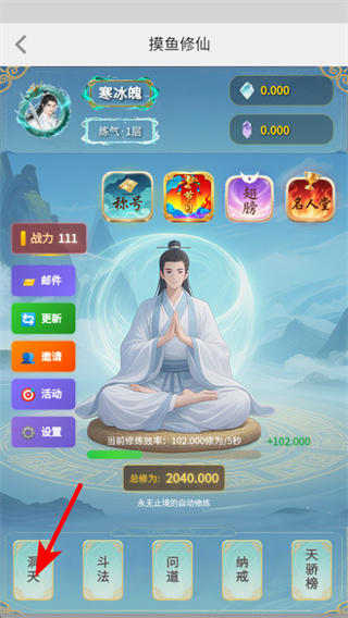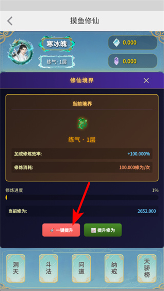 3、在修仙境界界面,點擊一鍵提升按鈕消耗修為值提升境界,境界提升可解鎖更強的屬性加成與功能,推進境界突破強化角色。