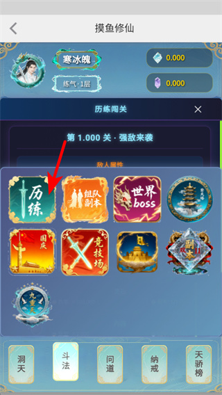 2、進入歷練闖關界面后,選擇歷練功能參與關卡挑戰(zhàn),通過闖關可獲取資源與歷練進度,這是積累修仙資源的核心方式之一。