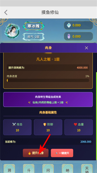 4、進入肉身界面后,點擊提升肉身按鈕消耗修為值強化肉身等級,肉身提升能增加攻擊基礎屬性,助力后續(xù)的關卡挑戰(zhàn)資源獲取。
