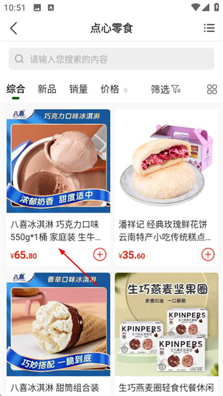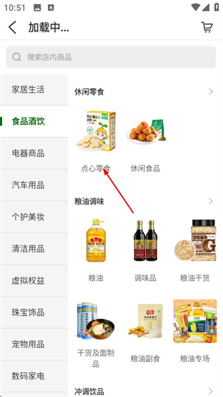 2、在子分類頁面,點(diǎn)擊點(diǎn)心零食選項(xiàng),進(jìn)入點(diǎn)心零食的商品列表頁。