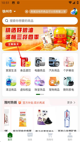 1、在樂采易購的首頁,點(diǎn)擊食品酒飲分類,進(jìn)入食品酒飲的子分類頁面。
