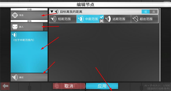 4、打開編輯節(jié)點(diǎn)界面,設(shè)置目標(biāo)距離條件,配置對(duì)應(yīng)行動(dòng)指令后點(diǎn)擊應(yīng)用,讓機(jī)甲按規(guī)則作戰(zhàn)。