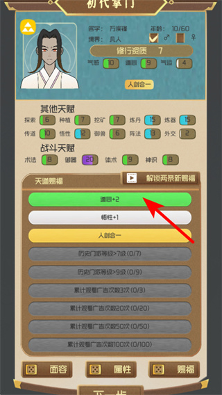2、在初代掌門界面,通過(guò)天賦福利功能獲取初始增益如增加悟性,這類福利能提升掌門的基礎(chǔ)屬性,助力仙門的發(fā)展與資源積累。