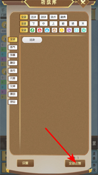 4、打開功法庫(kù)界面后,點(diǎn)擊全部出售按鈕處理閑置功法,獲取對(duì)應(yīng)的資源如靈石,這些資源可用于仙門建設(shè)、角色培養(yǎng)后續(xù)操作。
