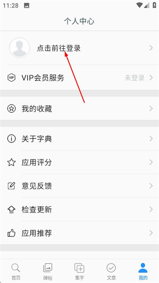 1、在顏真卿書法字典首頁,點擊底部的我的選項,進入個人中心頁面。