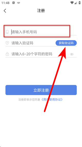 3、在注冊(cè)頁(yè)頁(yè)面,輸入手機(jī)號(hào)碼,點(diǎn)擊獲取驗(yàn)證碼。