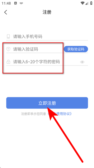 4、將收到的驗(yàn)證碼填入對(duì)應(yīng)框,設(shè)置密碼后,點(diǎn)擊立即注冊(cè),完成操作。