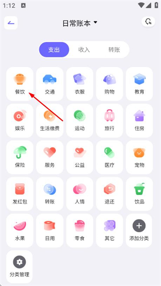 1、在首頁點擊記一筆按鈕,進入記賬分類選擇頁面。