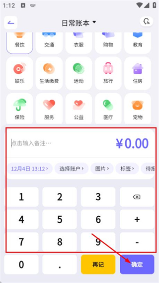 3、在記賬信息填寫頁面輸入金額、備注后,點擊確定按鈕,完成本次記賬操作。