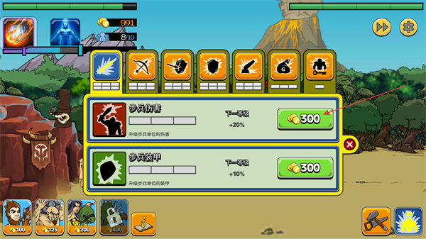 4、戰(zhàn)斗獲取資源后打開升級界面,選擇步兵傷害或步兵裝甲,消耗300金幣進行升級,提升步兵戰(zhàn)力以助力后續(xù)的戰(zhàn)斗進程。