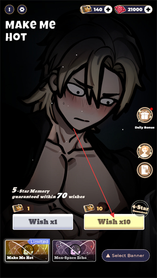 1、在該界面點擊SelectBanner選擇MAKEmeHOT卡池,使用Wishx1或Wishx10進行祈愿,70次內(nèi)保底獲得5-StarMemory。