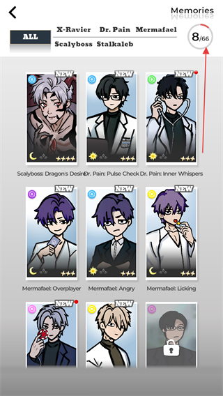 4、領(lǐng)取后進入Memories界面,可查看已獲得的卡牌,界面右上角顯示收集進度為8/66,可管理這些卡牌。