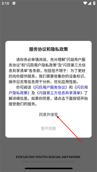 1、在服務(wù)協(xié)議和隱私政策彈窗中,點(diǎn)擊同意并接受按鈕,進(jìn)入閃目歡迎頁面。