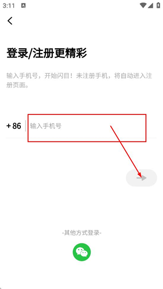 3、在登錄/注冊(cè)頁面,填寫輸入手機(jī)號(hào),點(diǎn)擊頁面箭頭按鈕,進(jìn)入驗(yàn)證碼輸入頁面。