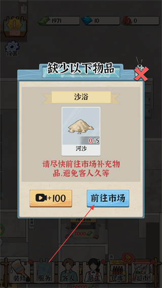 2、界面彈出缺少以下物品提示,顯示沙浴需河沙,點擊前往市場按鈕補充物品,避免客人等待過久。