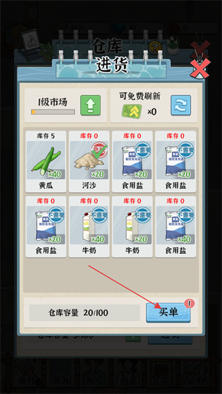 3、在倉庫進貨界面找到河沙,選中該物品后點擊底部買單,完成采購以補充沙浴所需物資。
