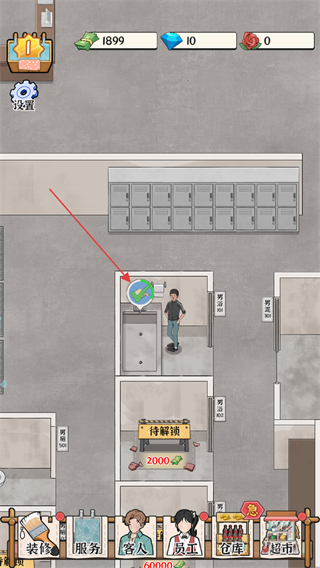 1、當前界面中點擊男浴室,了解該設(shè)施中顧客需求,可通過底部市場按鈕籌備所需資源以進行服務(wù)。