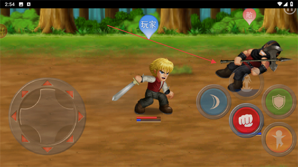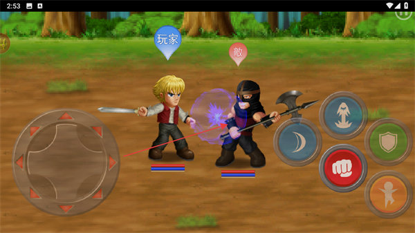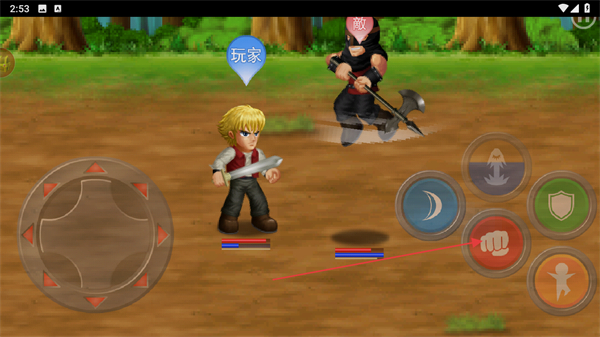 1、操控玩家角色移動,點(diǎn)擊技能按鈕攻擊敵角色,開啟對戰(zhàn)。