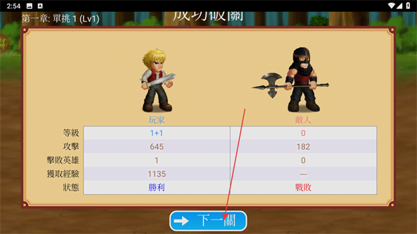 4、戰(zhàn)斗勝利后查看結(jié)算界面,點(diǎn)擊下一關(guān)進(jìn)入下一個關(guān)卡。
