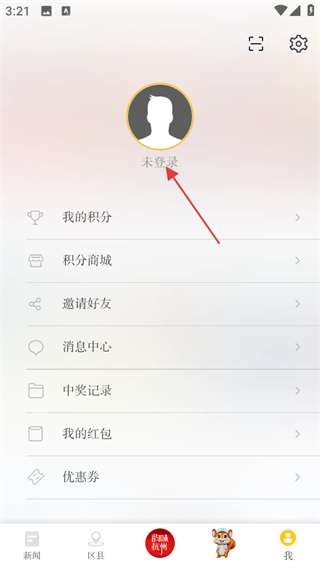 2、在個人中心頁面,點擊未登錄區(qū)域,進入登錄頁面。