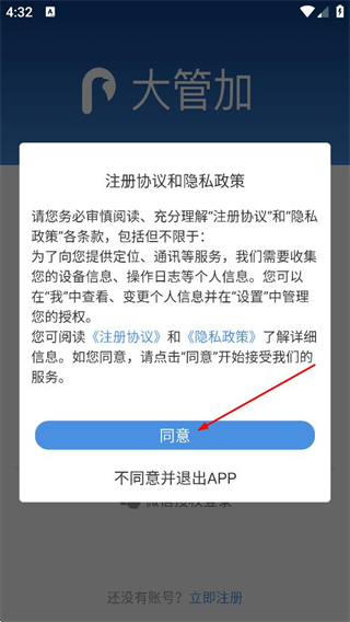 1、在注冊協(xié)議和隱私政策彈窗中,點(diǎn)擊同意,進(jìn)入登錄頁面。