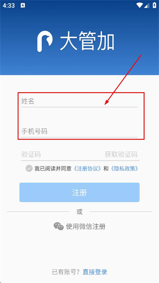 3、在注冊頁面,即可依次填寫姓名與手機(jī)號碼這兩項信息。