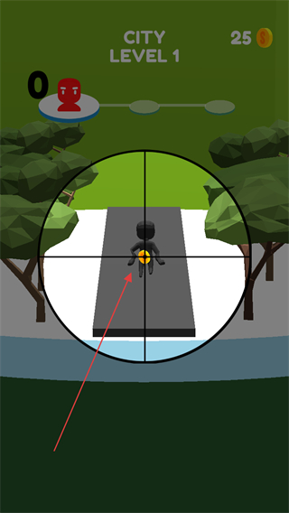 1、在CITYLEVEL1關(guān)卡,用狙擊鏡瞄準(zhǔn)紅色目標(biāo),準(zhǔn)備射擊。