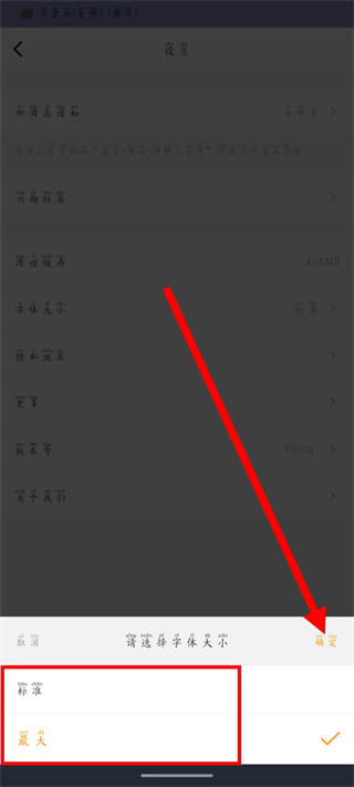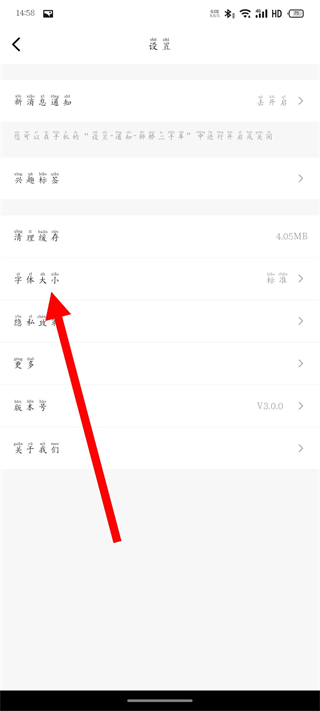 3、在設(shè)置頁面,點(diǎn)擊字體大小,彈出字體選擇彈窗。